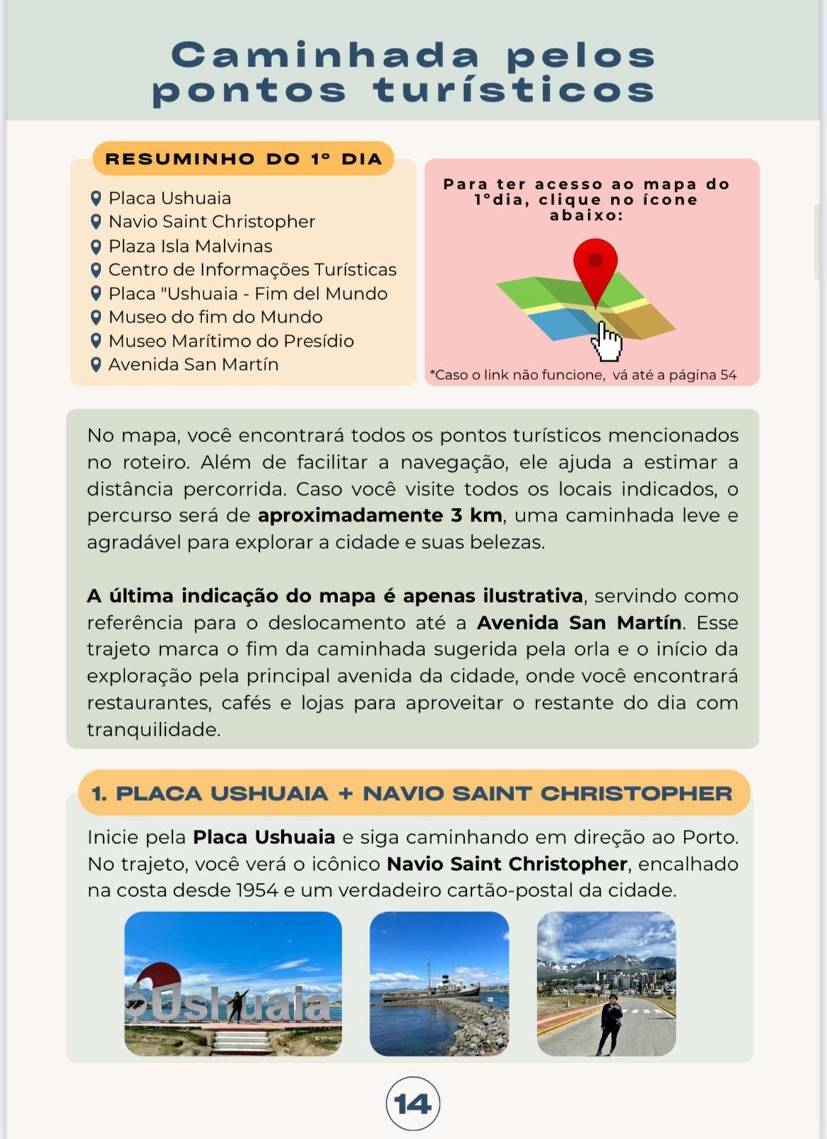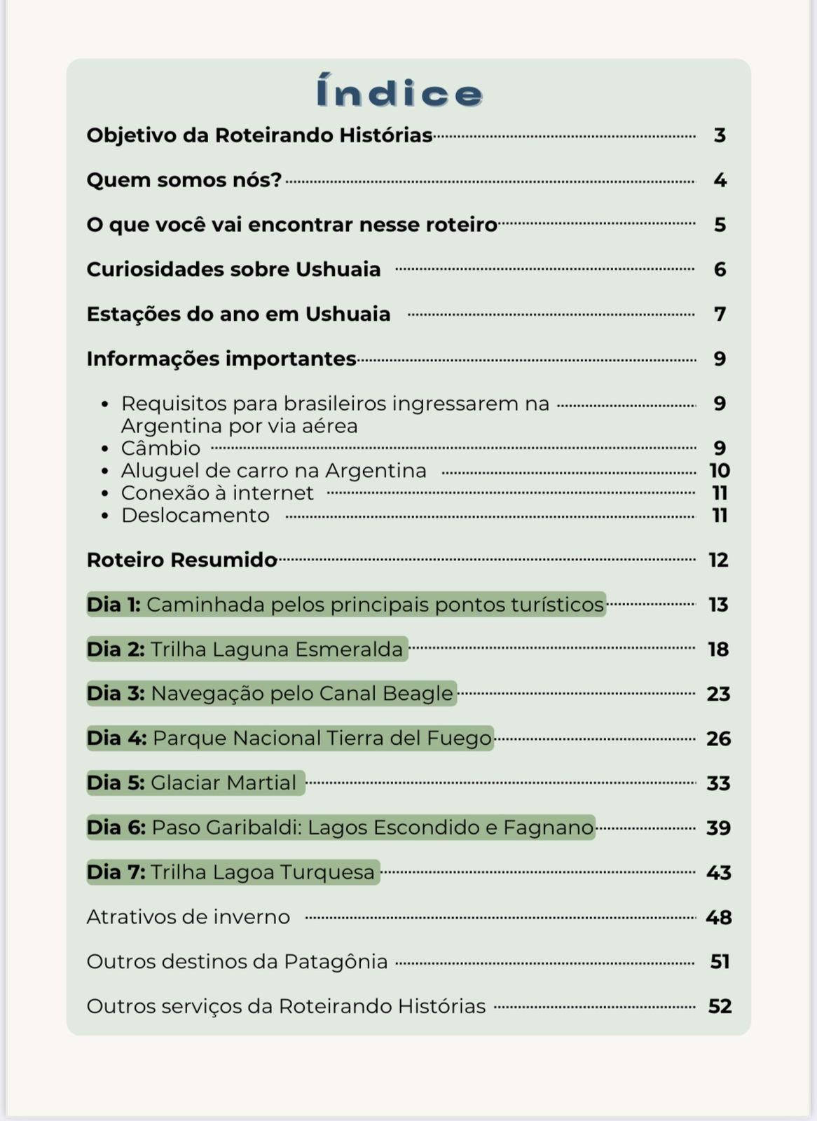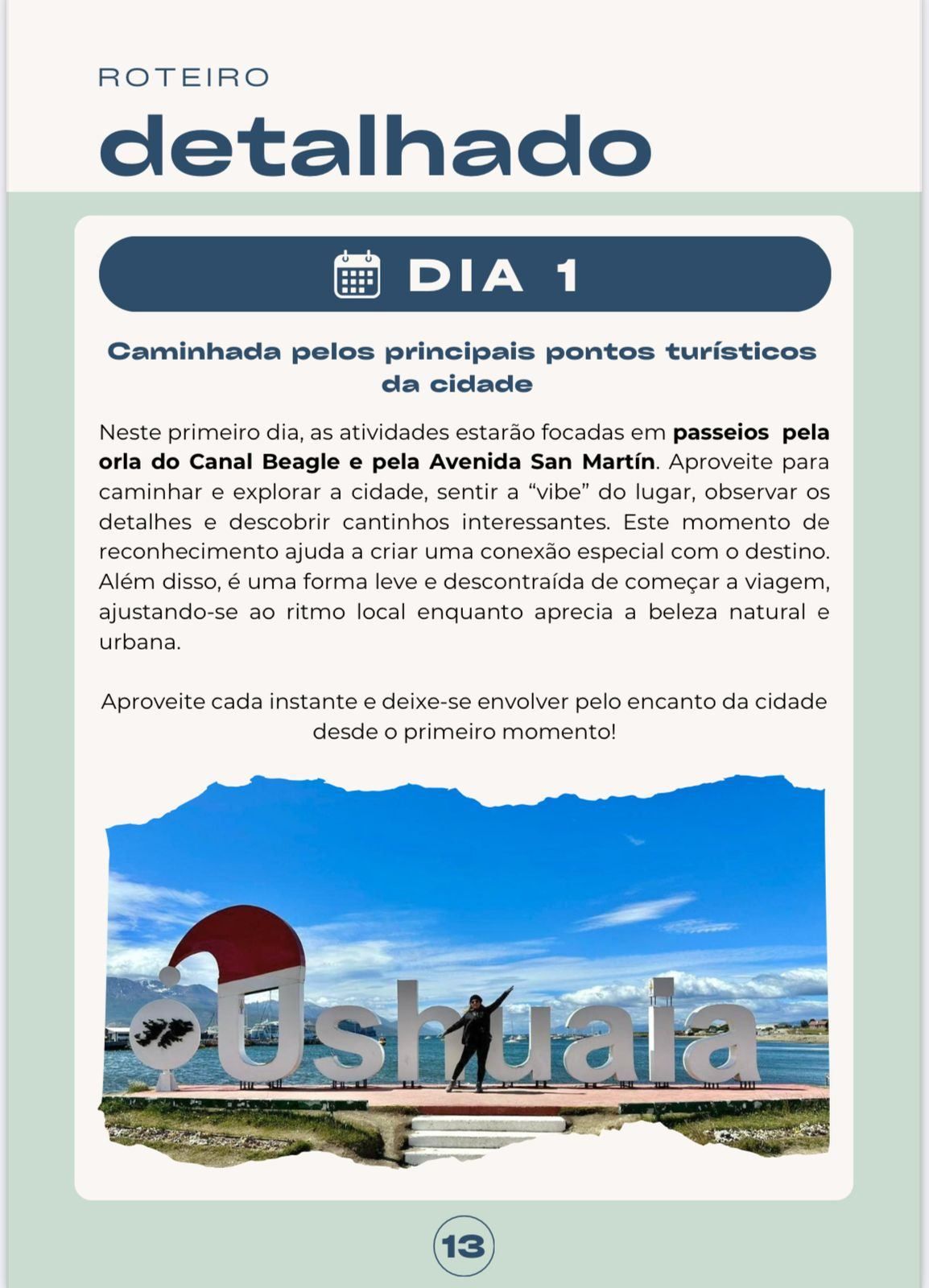 O material inclui um dia a dia detalhado, com sugestões de passeios, trilhas e atrações imperdíveis, como a Laguna Esmeralda, o Canal Beagle, o Parque Nacional Tierra del Fuego e o Glaciar Martial. Além disso, você encontrará informações essenciais sobre requisitos de entrada no país, câmbio, aluguel de carro, deslocamento e conexão à internet.